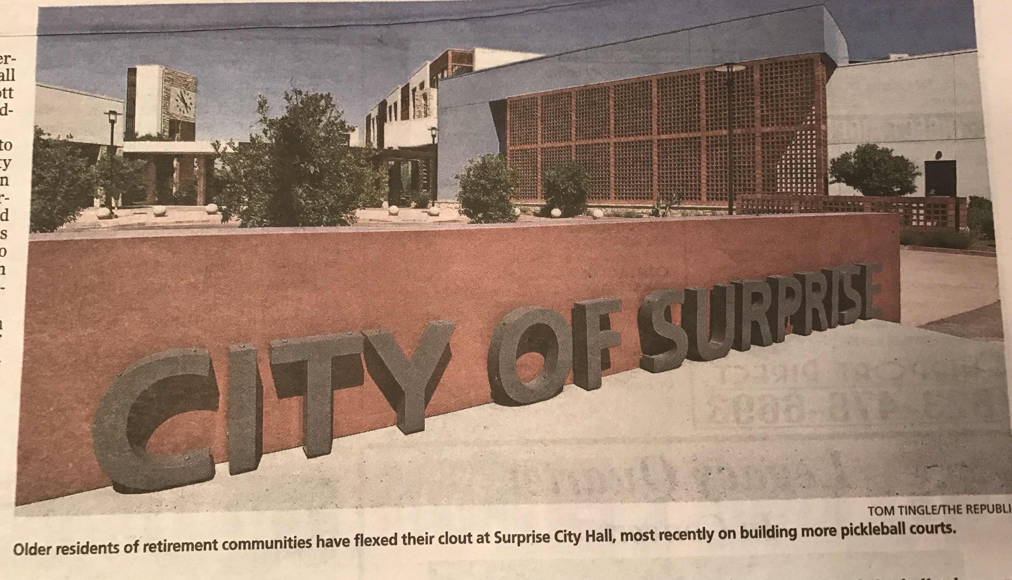 I love the caption under this photo from a section of the Arizona Republic newspaper today. Shows you how huge pickleball is getting if this is the biggest thing the retirees have on their minds!!