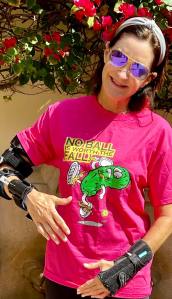 Meg, modeling her NO BALL IS WORTH THE FALL tee shirt, along with her broken elbow and wrist from a pickleball accident.